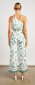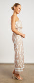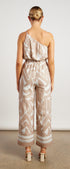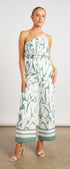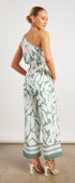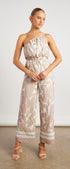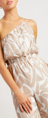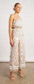 Faux Linen Placement Print Jumpsuit with Shirred Waist